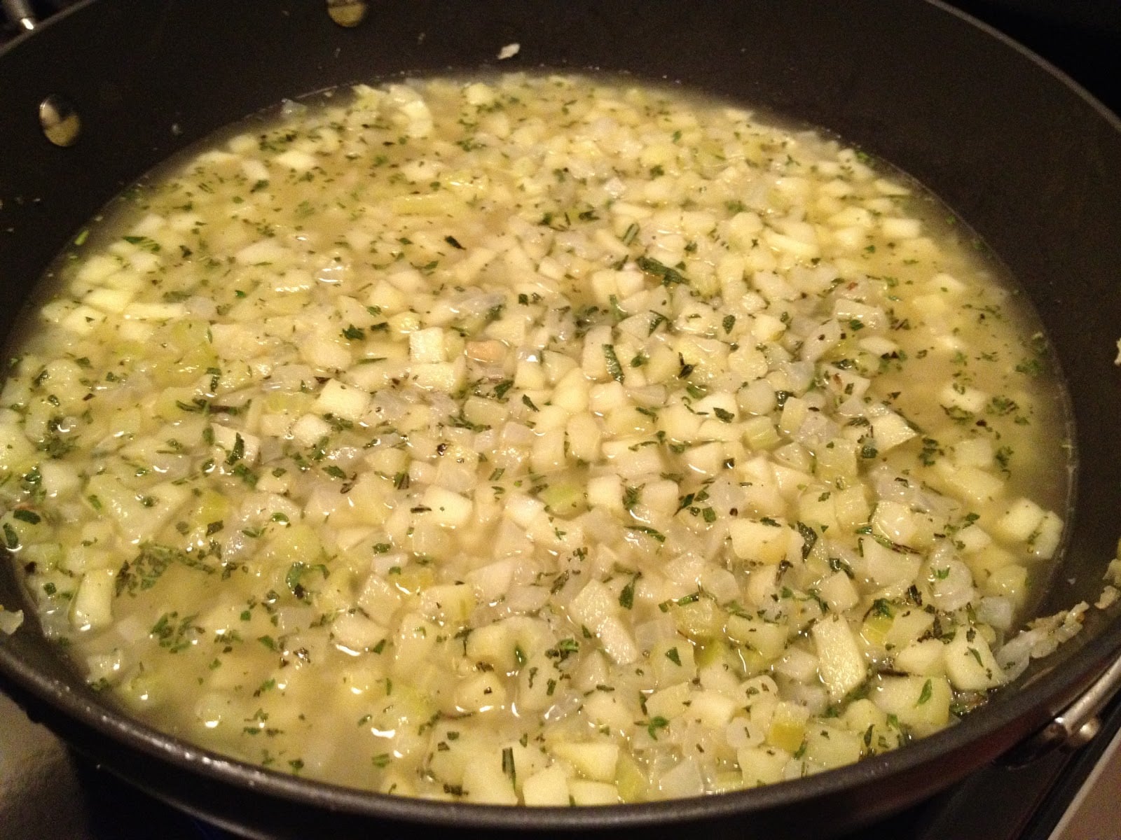 -In the same pan, melt 4 tbsp butter and add the celery, onion, and apple. Sauté five minutes until soft, then add the herbs. Cook two minutes more, add the chicken stock and bring it to a boil.