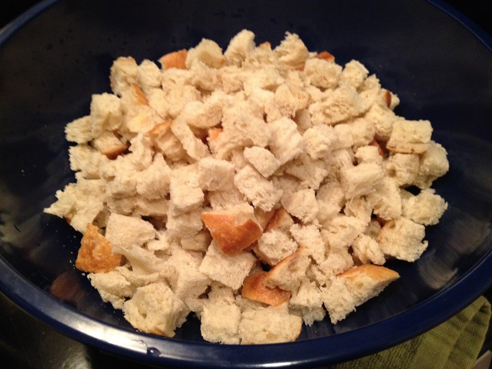 - Cut stale bread into ¾ inch cubes and place them in a large mixing bowl. (If you don’t have the time to wait for bread to go stale, you can put the cubes on a cookie sheet and dry them out in a 300 the oven for about 10 minutes. Just make sure they don’t brown too much!)