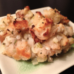 -Cut stale bread into ¾ inch cubes and place them in a large mixing bowl. (If you don’t have the time to wait for bread to go stale, you can put the cubes on a cookie sheet and dry them out in a 300 the oven for about 10 minutes. Just make sure they don’t brown too much!)