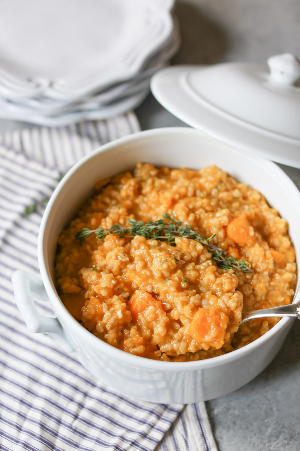 Lest you think I’ve gone full Debbie Downer on you, friends, I was just getting to the happy part! I’m incredibly grateful for my Vienna Boys’ Choir experience for several reasons. First, I finally got to see Carnegie Hall, which was every bit as majestic as I imagined. Second, I can cross “choir groupie” off my list of potential hobbies (it is helpful to know what you do NOT like in life as well as what you do!). And finally, my boredom and angst during the concert led to my spending almost two full hours daydreaming about food, which reminded me that I had completely forgotten to share this fabulous Butternut Squash Brown Rice with Fontina and Thyme with you. Silver lining to end all silver linings!