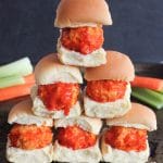While I won’t be cooking this Sunday, I have concocted a rather elaborate fantasy menu in my head for the occasion. Obviously, it includes all the standard players (nachos, guacamole, chili, quesadillas, and wings), but the show-stopping, game changing, mind-blowing centerpiece is a tower of Cheesy Buffalo Chicken Meatball Sliders.