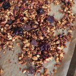 dark-chocolate-cherry-granola-with-crunchy-quinoa-vegan-gluten-free-step-5-Transfer the granola to the oven and cook for 35-40 minutes until it’s golden brown. Remove the baking sheets from the oven every ten minutes and give the granola a stir to make sure it bakes evenly.