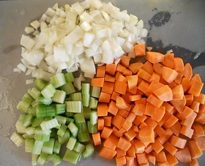 - Peel your carrots, celery, and onion, and then chop each mirepoix- this is a fancy French term that I shall poetically translate as “rough cubes.”