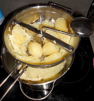 -Strain your potatoes and then MASH them with the cubes of butter. I like to use a vegetable grinder (as pictured), since it makes the potatoes perfectly smooth. However, you can mash your potatoes with an electric mixer or by hand. Whatever floats your boat.