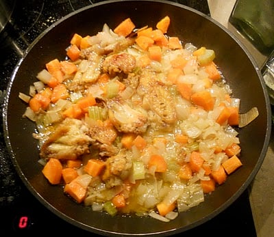 -Peel your carrots, celery, and onion, and then chop each mirepoix- this is a fancy French term that I shall poetically translate as “rough cubes.”