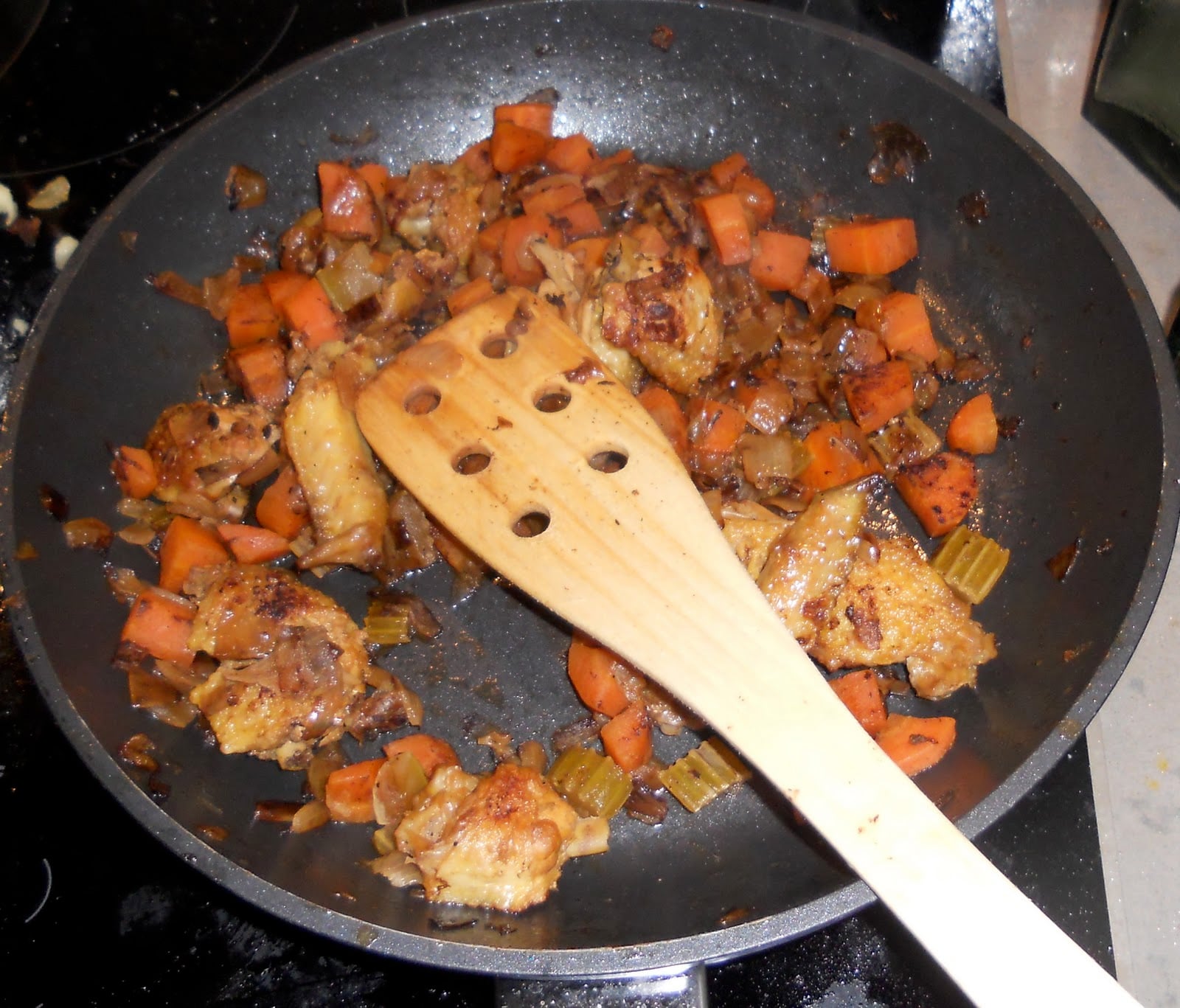 -Heat some oil in a saucepan, and when it is very hot (spitting), add the chicken wings. Keep on the heat until they are a golden brown, stirring intermittently. Remove from heat.