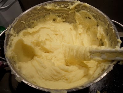 -Boil the potatoes until very tender. (To see if your potatoes are cooked, peirce them with a knife. If the knife slides in easily, those suckers are done.)