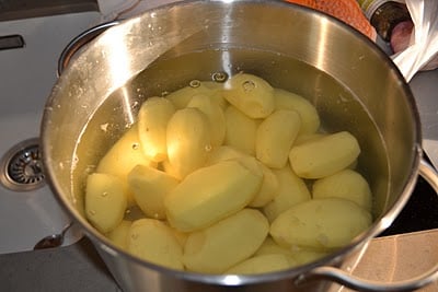 *Some white, foamy starch will collect on the surface of the water as the potatoes cook. Skim the starch of periodically with a large spoon.