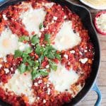 -Remove the skillet from the heat and use a spatula or spoon to make 5 wells (about 2 inches wide) in the sauce. Carefully crack an egg into each of the wells.