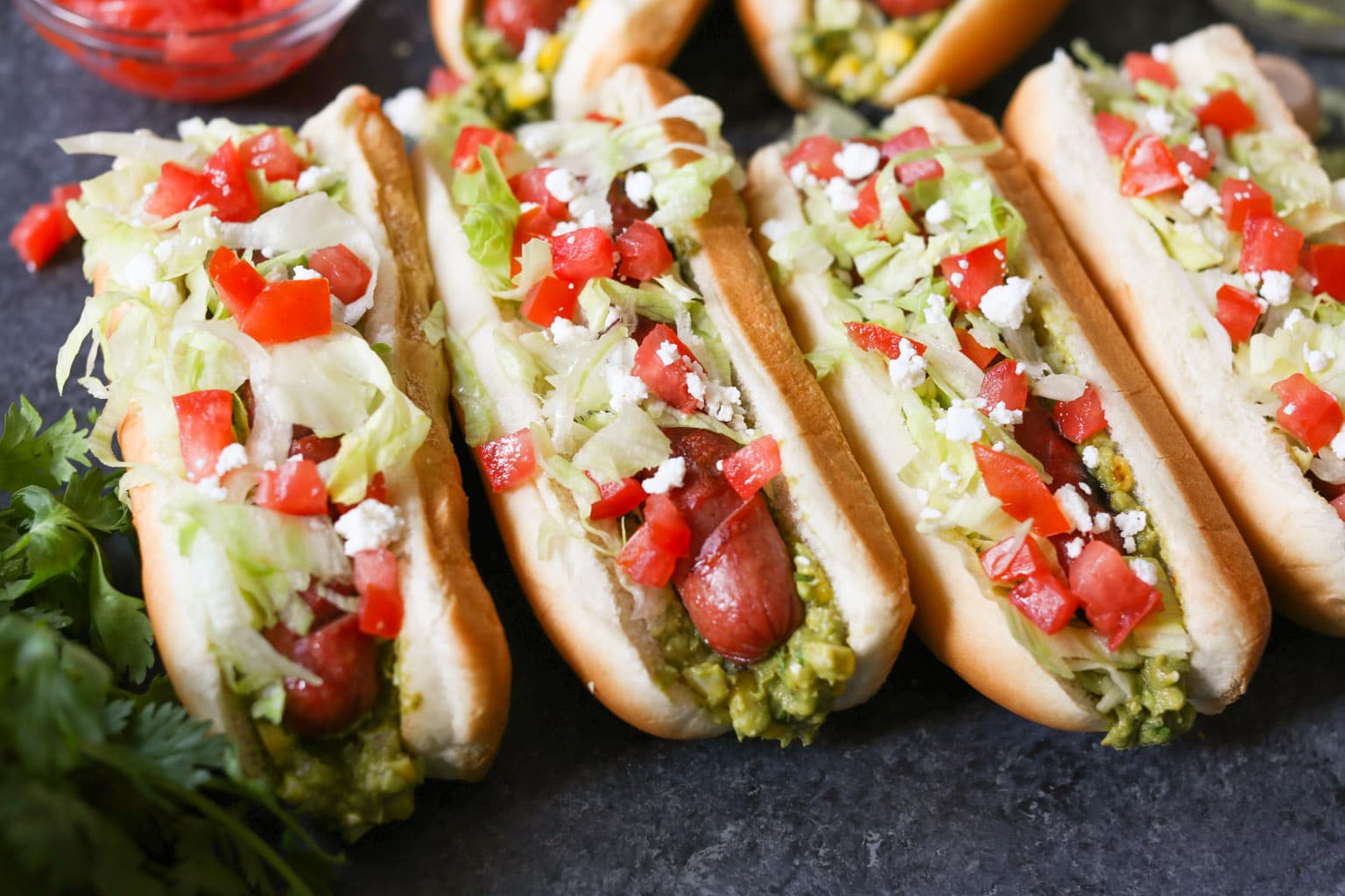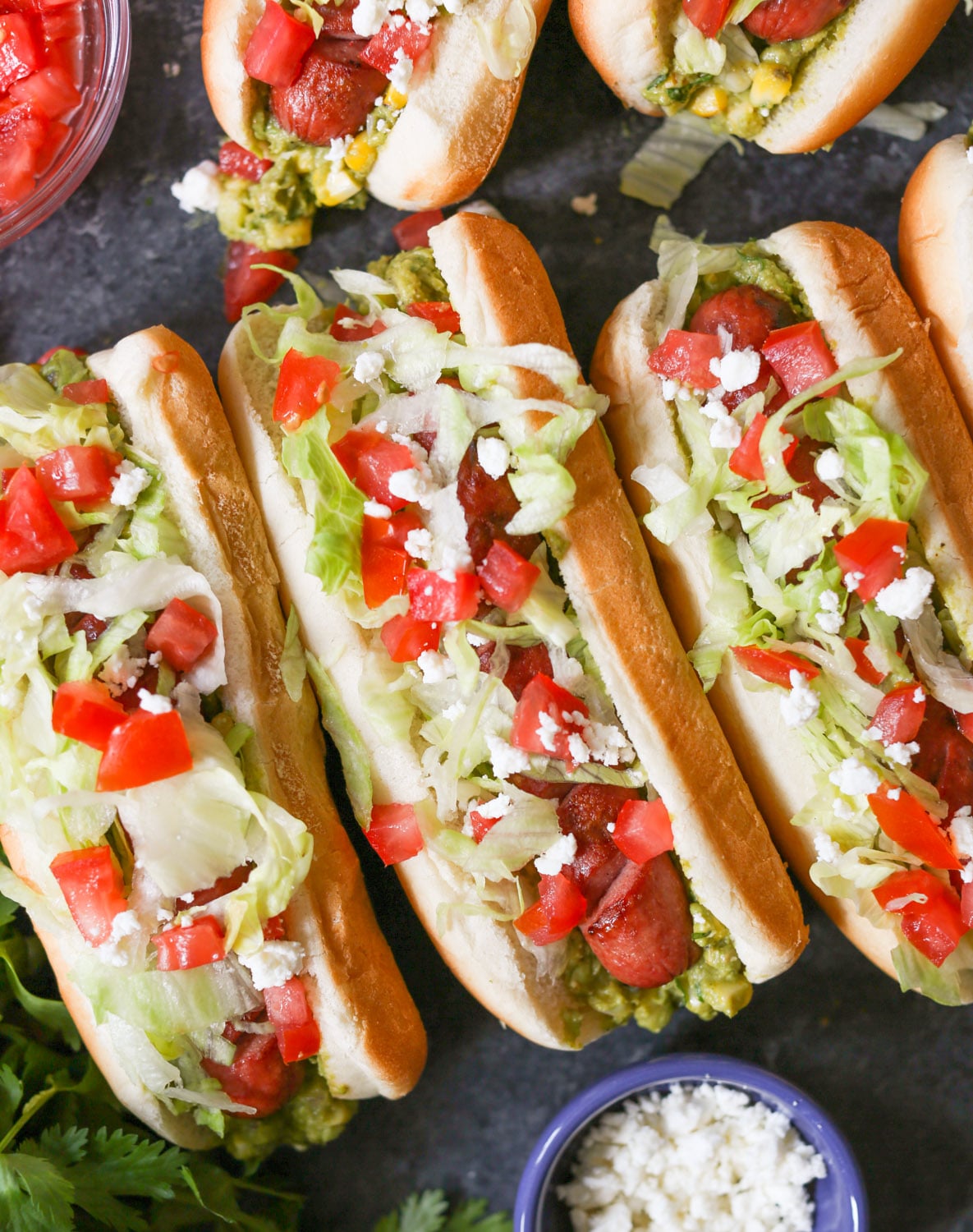 - Assembly time! Spread the inside of each hot dog bun with a generous amount of guacamole. Nestle the hot dogs in the prepared buns and top with lettuce, tomato and hot sauce (if using). Garnish with a little extra cheese if you’re feeling particularly festive. Serve immediately.