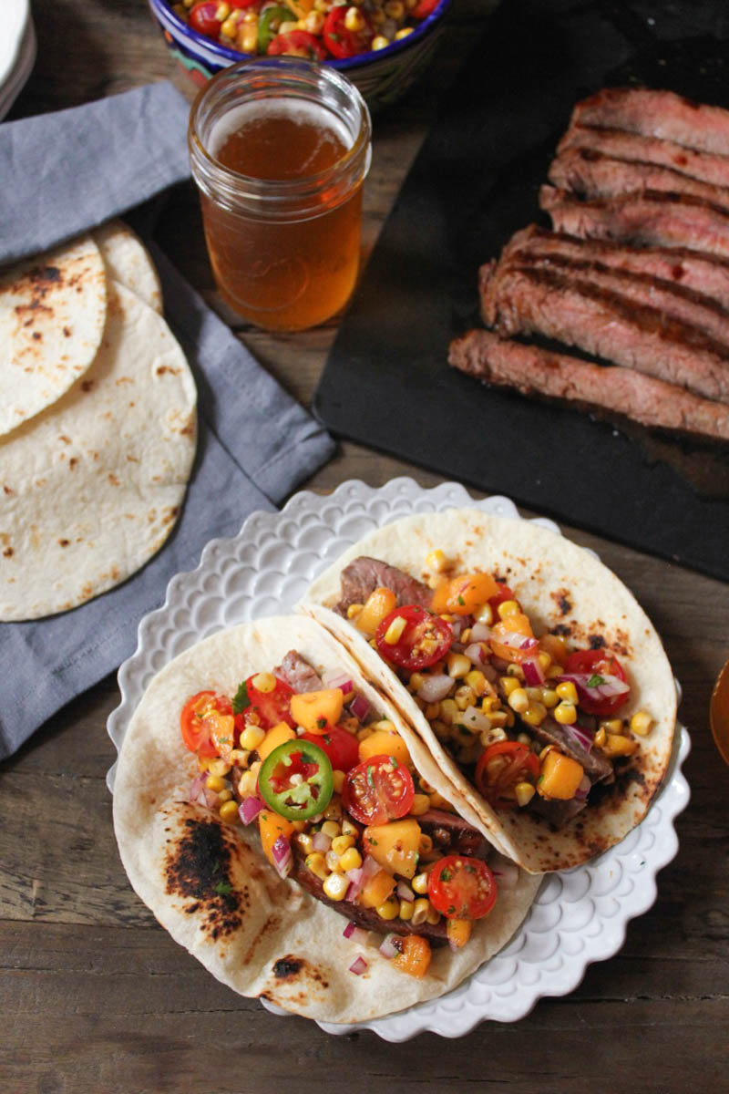 Fiery Barbecue Flank Steak Tacos with “Summer Mess” Salsa