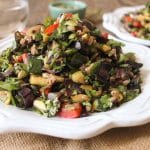 grilled-vegetable-salad-with-farro-3A mix of five different grilled vegetables, baby lettuces, farro, and toasted pepitas tossed in a simple balsamic vinaigrette, this summery salad is literally bursting at the seams with fresh flavor and texture. It’s light, yet satisfying, and in addition to its sexy appearance, it also boasts some pretty serious nutritional benefits. Thanks to the fiber, antioxidants, and vitamin C it’s packing, you can look forward to improved digestion, decreased cancer risk, and an increase in your skin’s general glow. Exciting!