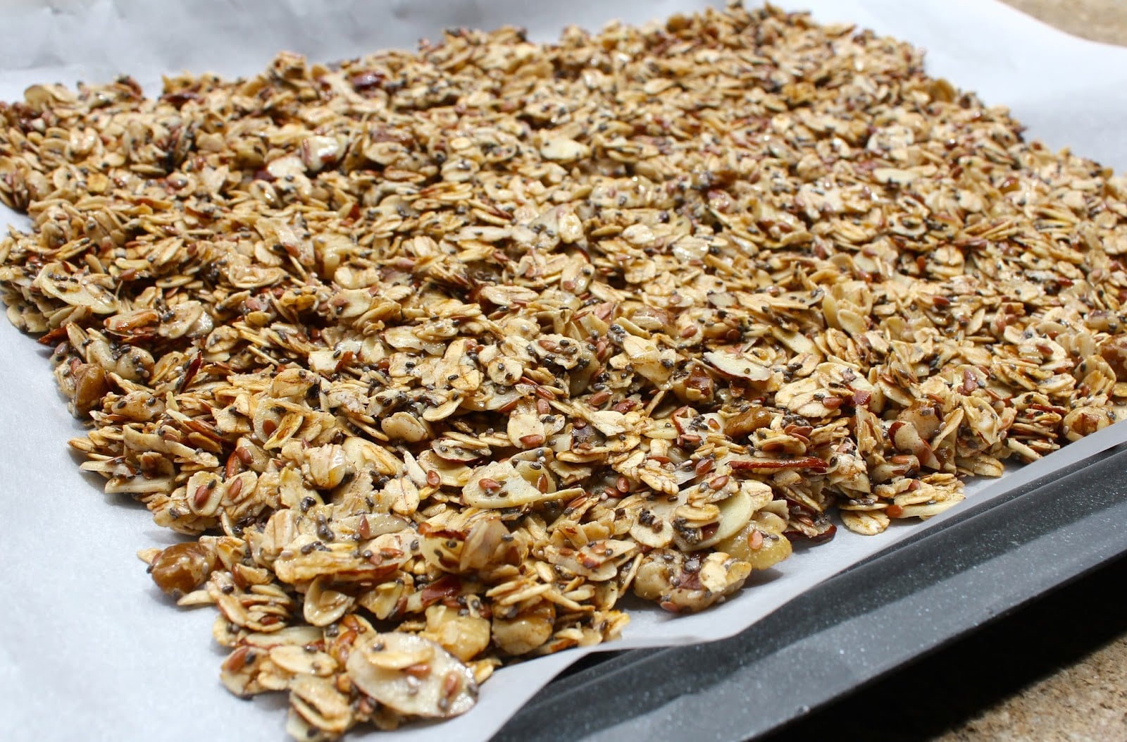 - Spread the granola onto 2 parchment-lined baking sheets.
