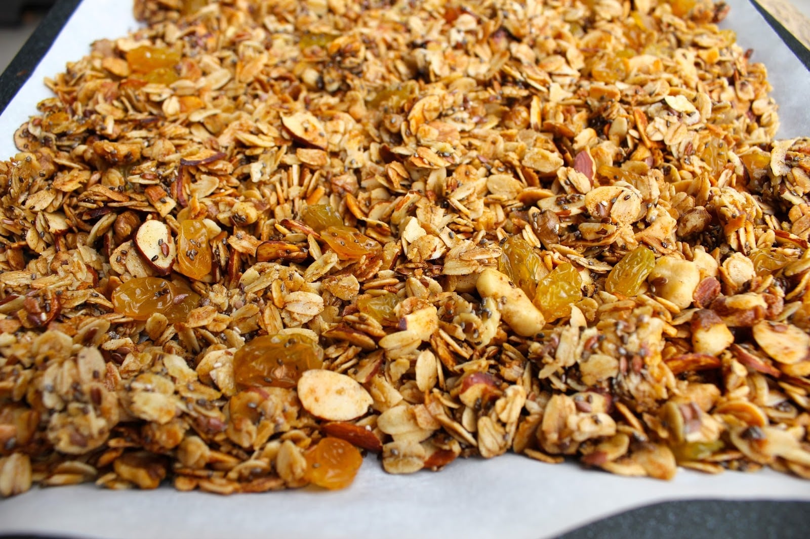 - Transfer the granola to a wire rack to cool. (If you don’t have a wire rack, don’t panic. Just slide the parchment onto your countertop and let the granola cool.) When cool, break up the granola and sprinkle with the golden raisins.