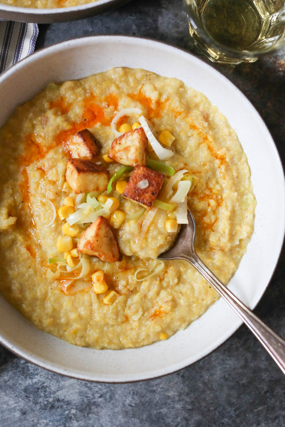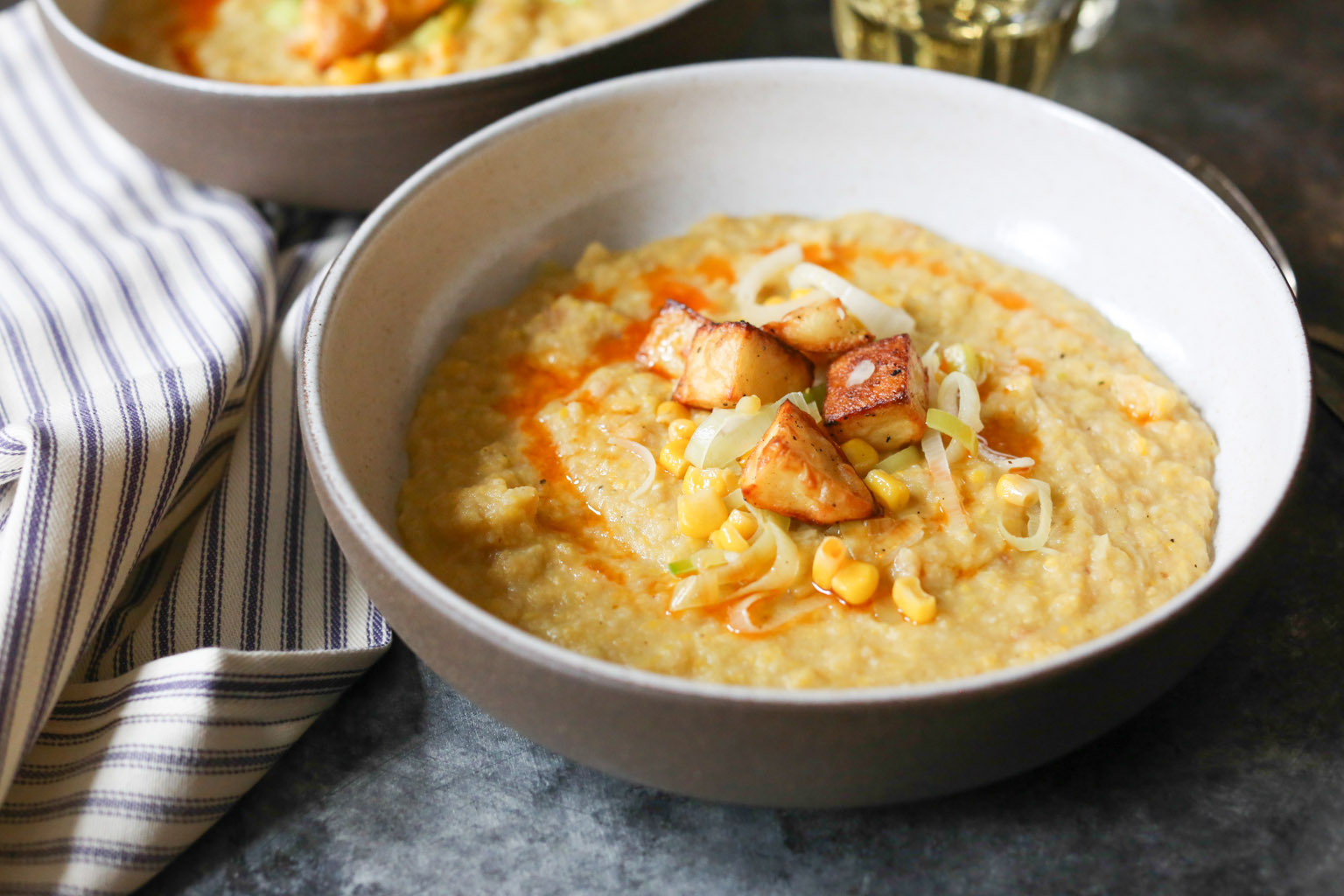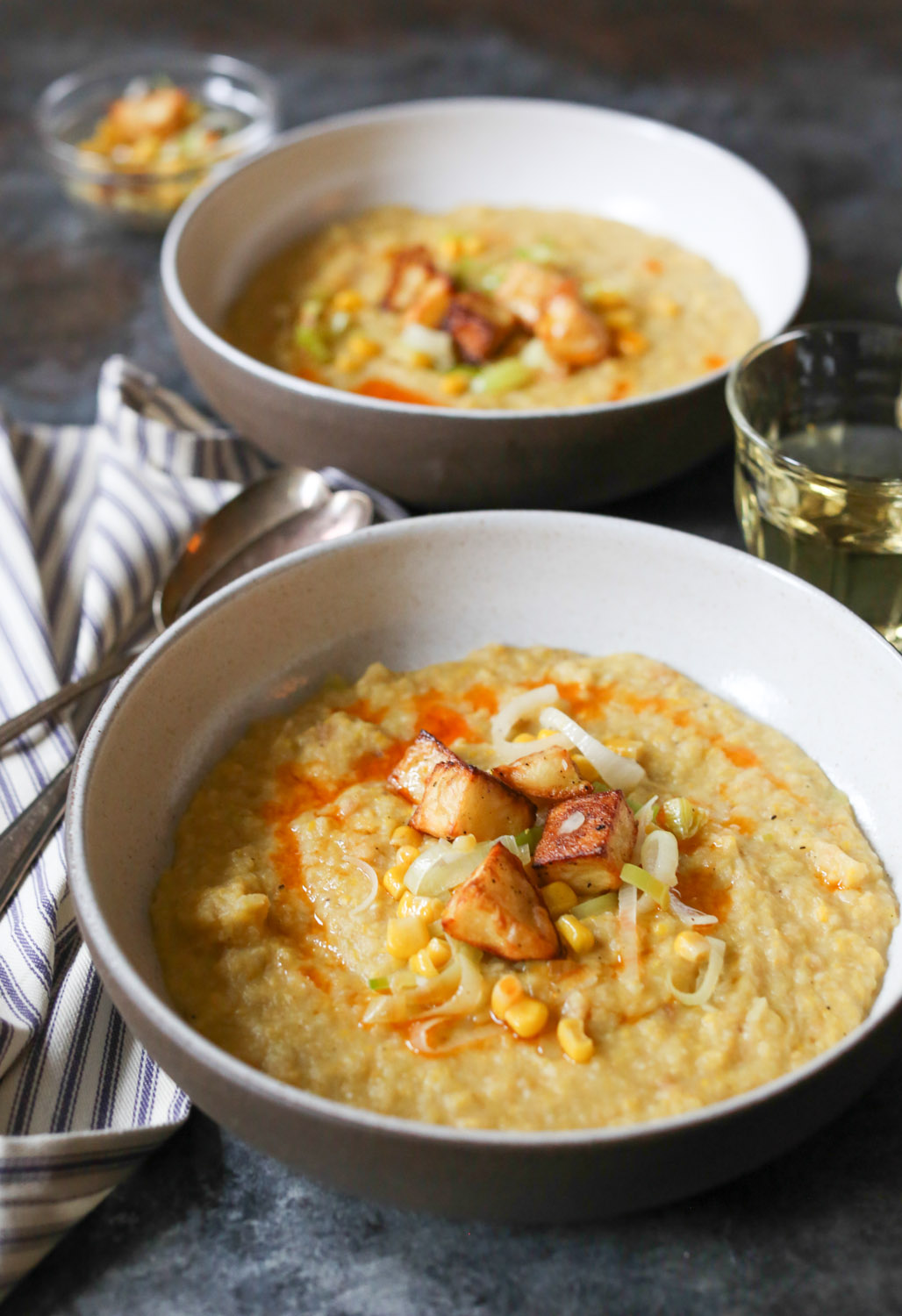 A few quick recipe notes. Since it’s not corn season, I used canned sweet corn, but I love the idea of using grilled corn during the summer months and serving the soup at room temp. If you follow the recipe as written, the soup will be super thick. I’m into that, but if you’re not, just keep adding veggie broth until you reach your desired consistency. And if you don’t feel like turning on the oven, you can definitely skip the roasting step and throw the raw potatoes into the soup (after the veggie broth) and simmer until tender. Finally, I was obsessed with the potato-corn-leek medley garnish. Next time, I’ll probably add an extra leek and ear of corn into the mix and roast an extra potato, so I can have more topping action. You might want to do the same.