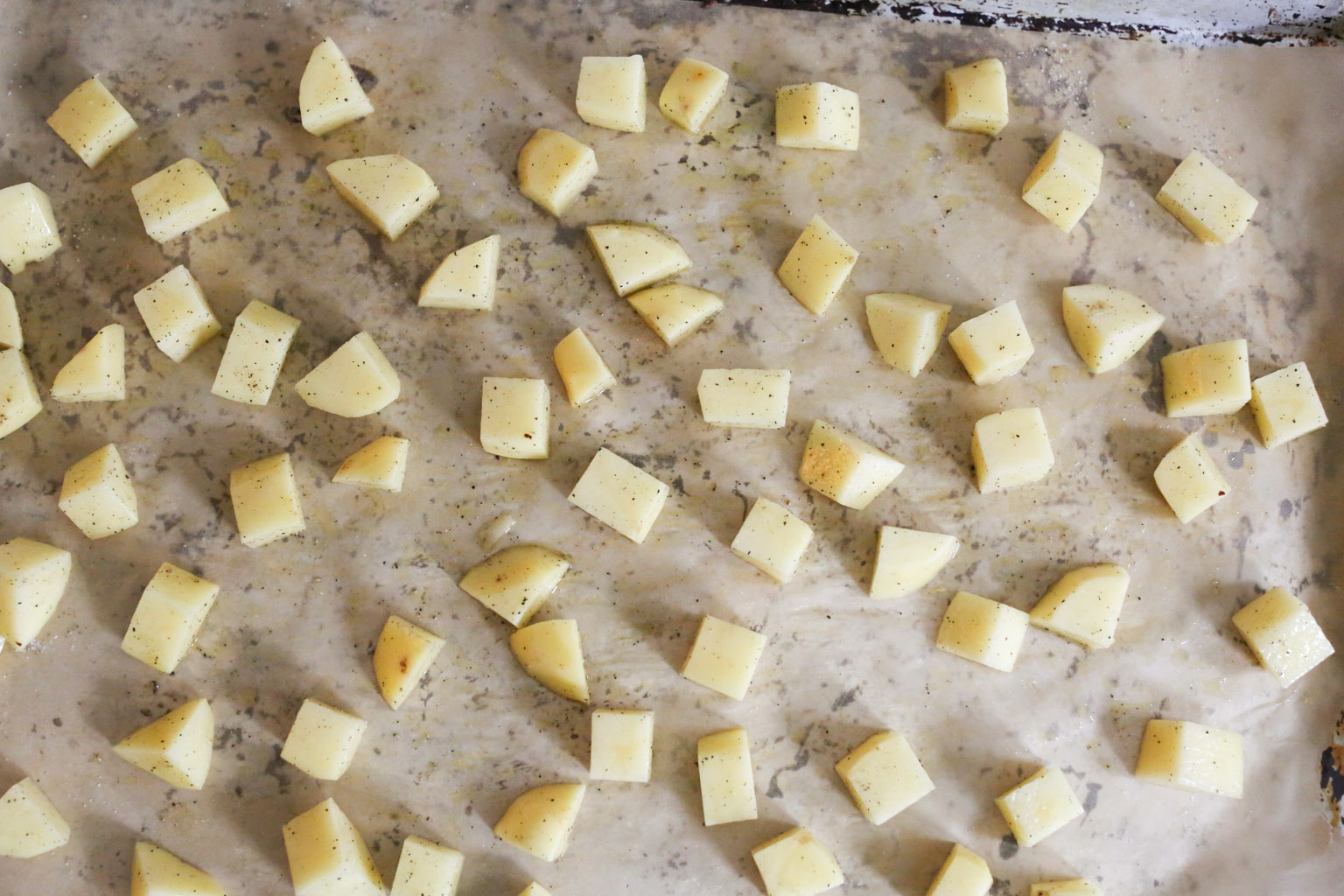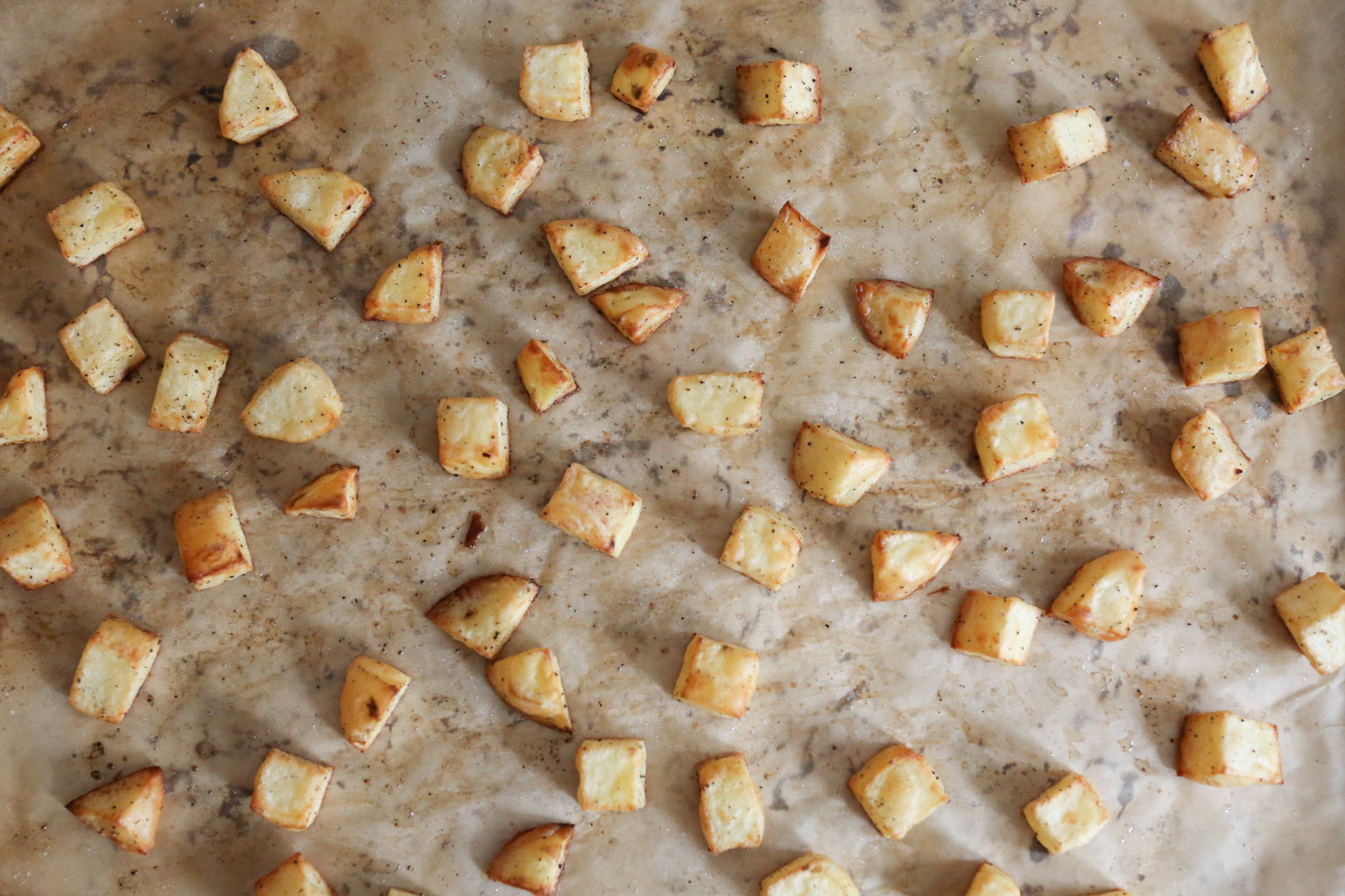 -Pre-heat the oven to 425 degrees and line a baking sheet with parchment paper. Toss the potatoes with a little olive or melted coconut oil and salt and pepper.