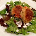 - Arrange salad on a plate and sprinkle with 2 tbsp crumbled goat cheese. Place quinoa cakes on top of the salad. Voila!