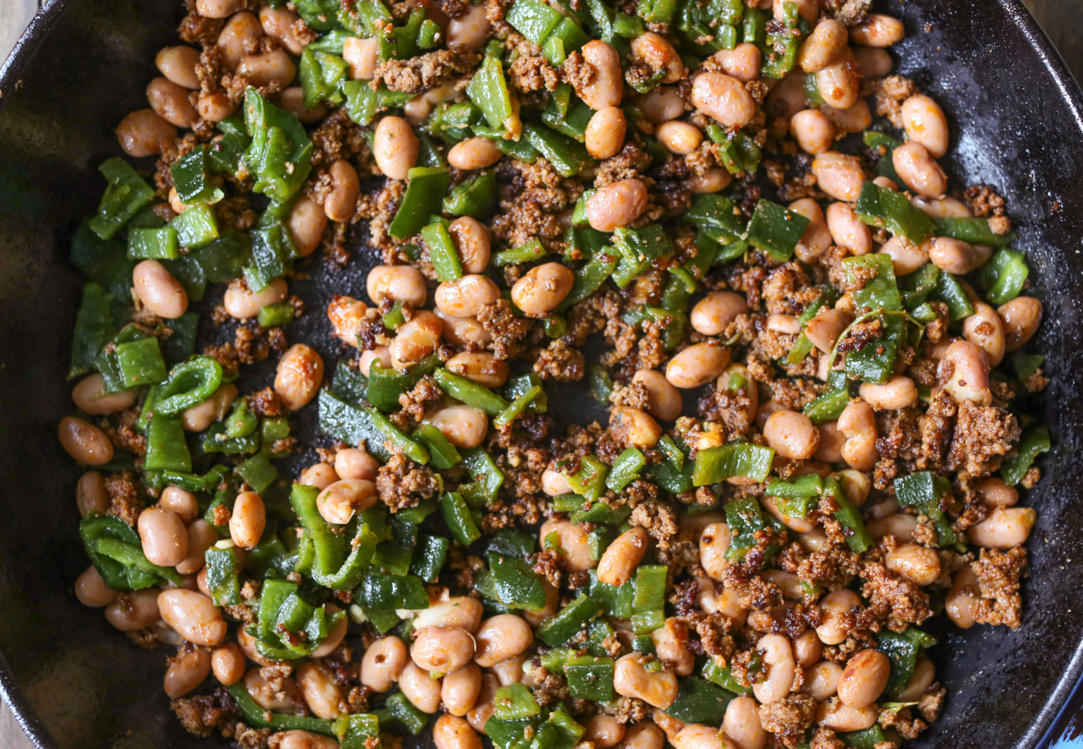 - Heat a large (12- to 14-inch) cast iron skillet over medium-high heat. When hot, add the ground beef to the pan. Cook for about 5 to 7 minutes, stirring and breaking up the meat into very small pieces with a spatula or wooden spoon, until completely browned. Add 1¾ teaspoons of the smoked paprika and the cumin to the beef. Cook for 1 minute to toast the spices then stir in the chopped peppers and pinto beans. Stir in the salsa, making sure to scrape up any browned bits from the bottom of the pan.