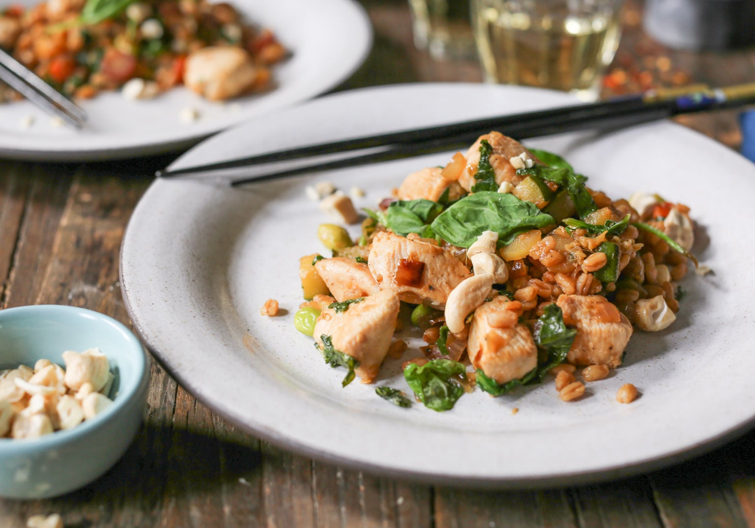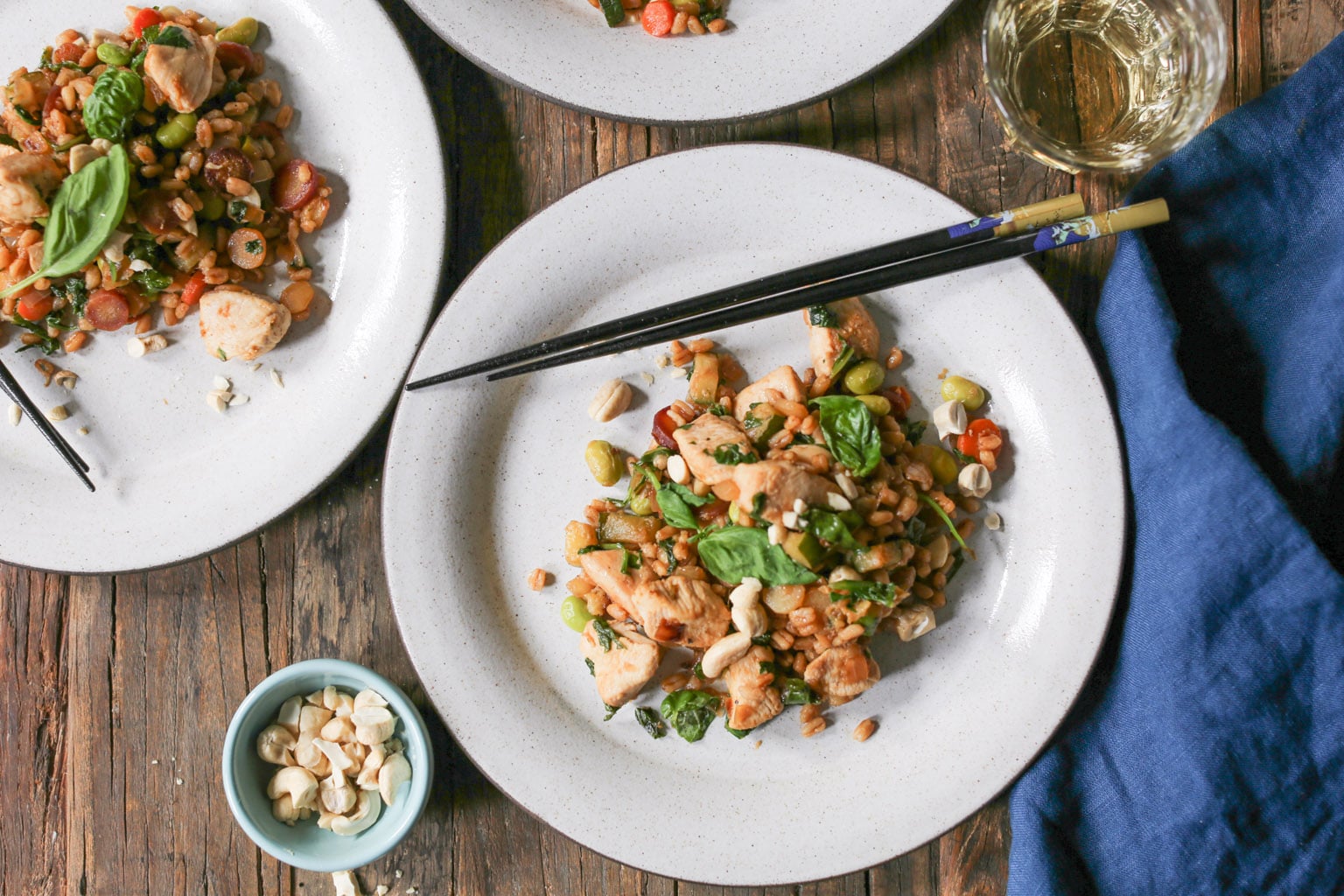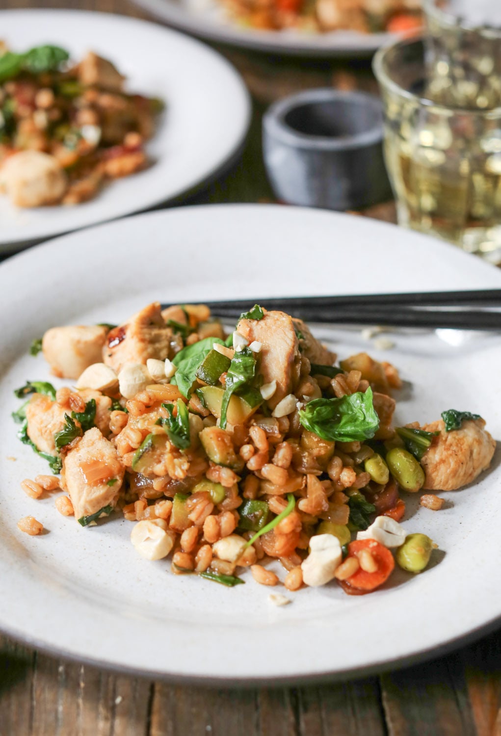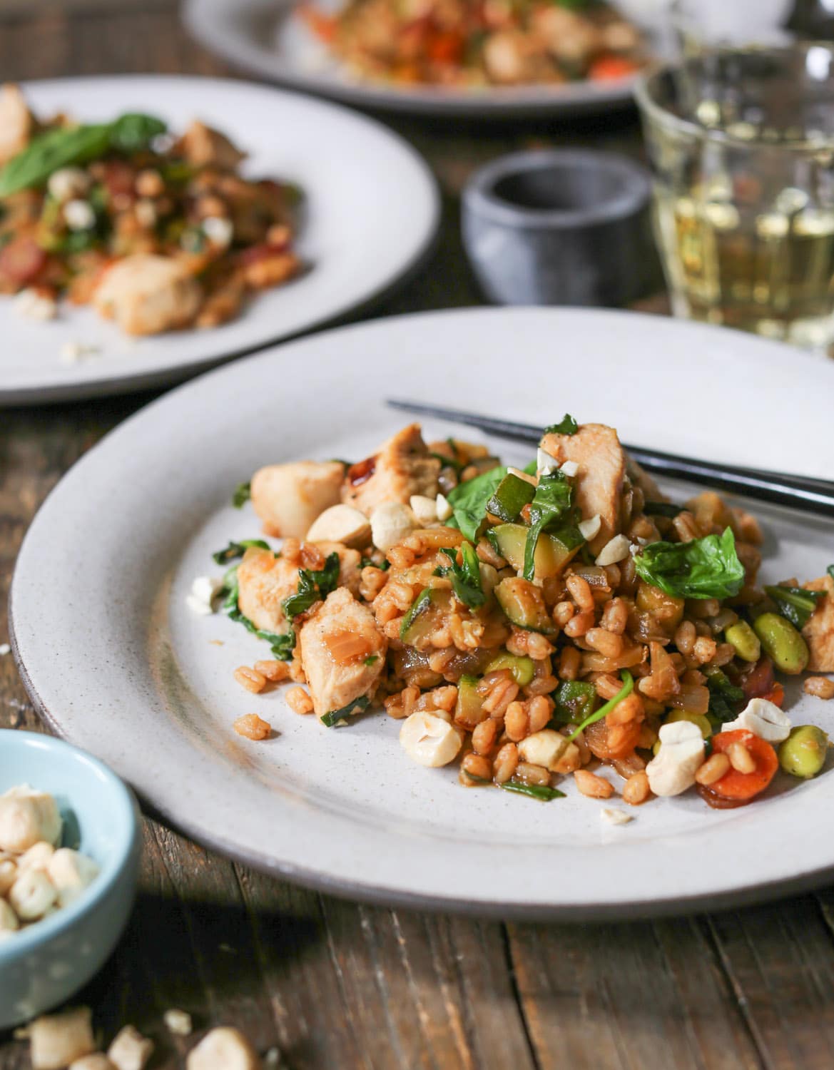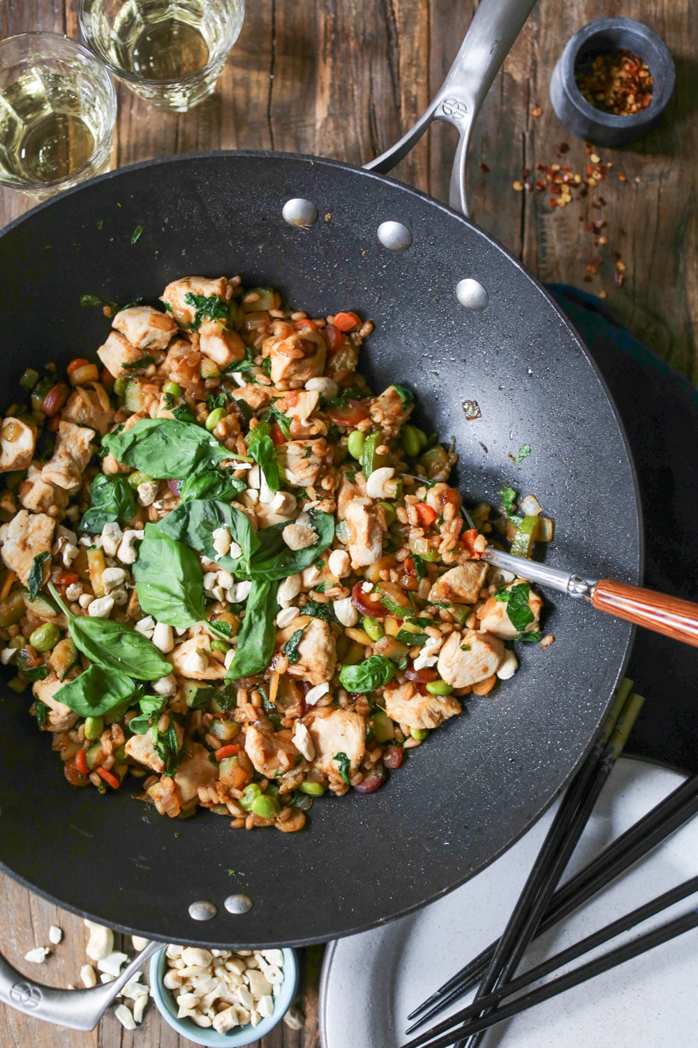 FYI, this recipe is also excellent with shrimp, thinly sliced beef, and dry-fried tofu for the veg-heads. Gluten-sensitive peeps, go ahead and sub tamari for soy sauce and swap brown rice (or any other whole grain you like) for the farro. And you should all feel free to get creative with toppings! I’m partial to basil for sweetness and raw cashews for healthy fats and crunch, but that’s just me. Scallions, any combo of fresh herbs, nuts, sesame or hemp seeds, and even furikake would be fabulous. I believe in your creativity.