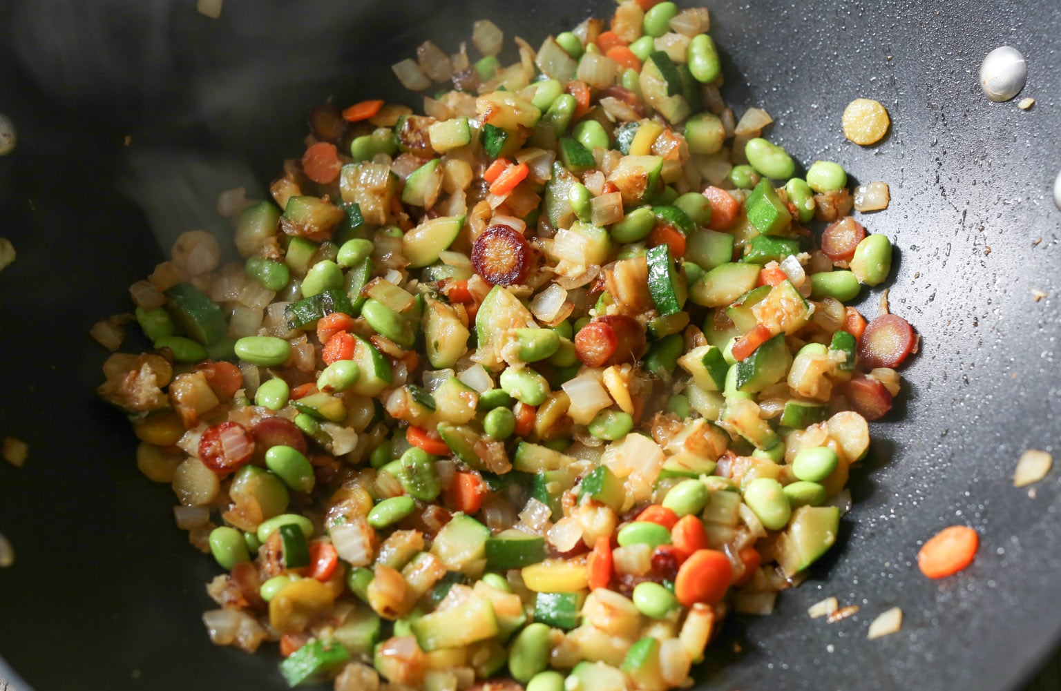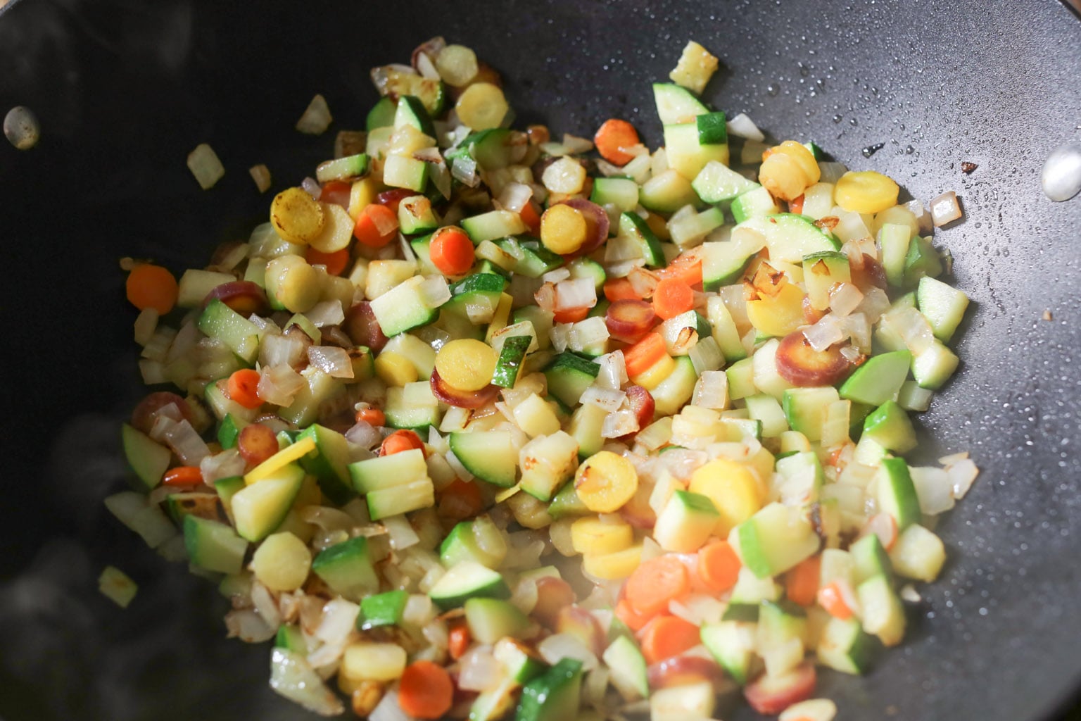 -Return the pan to the heat and add the remaining 1½ tablespoons coconut oil. When the oil is hot and shimmering, add the onion, zucchini, and carrots to the pan. Cook until the vegetables are tender (but not mushy!), about 5-7 minutes. (I like to let my vegetables brown a little, but if you’re not into that, simply turn the heat down to medium.)