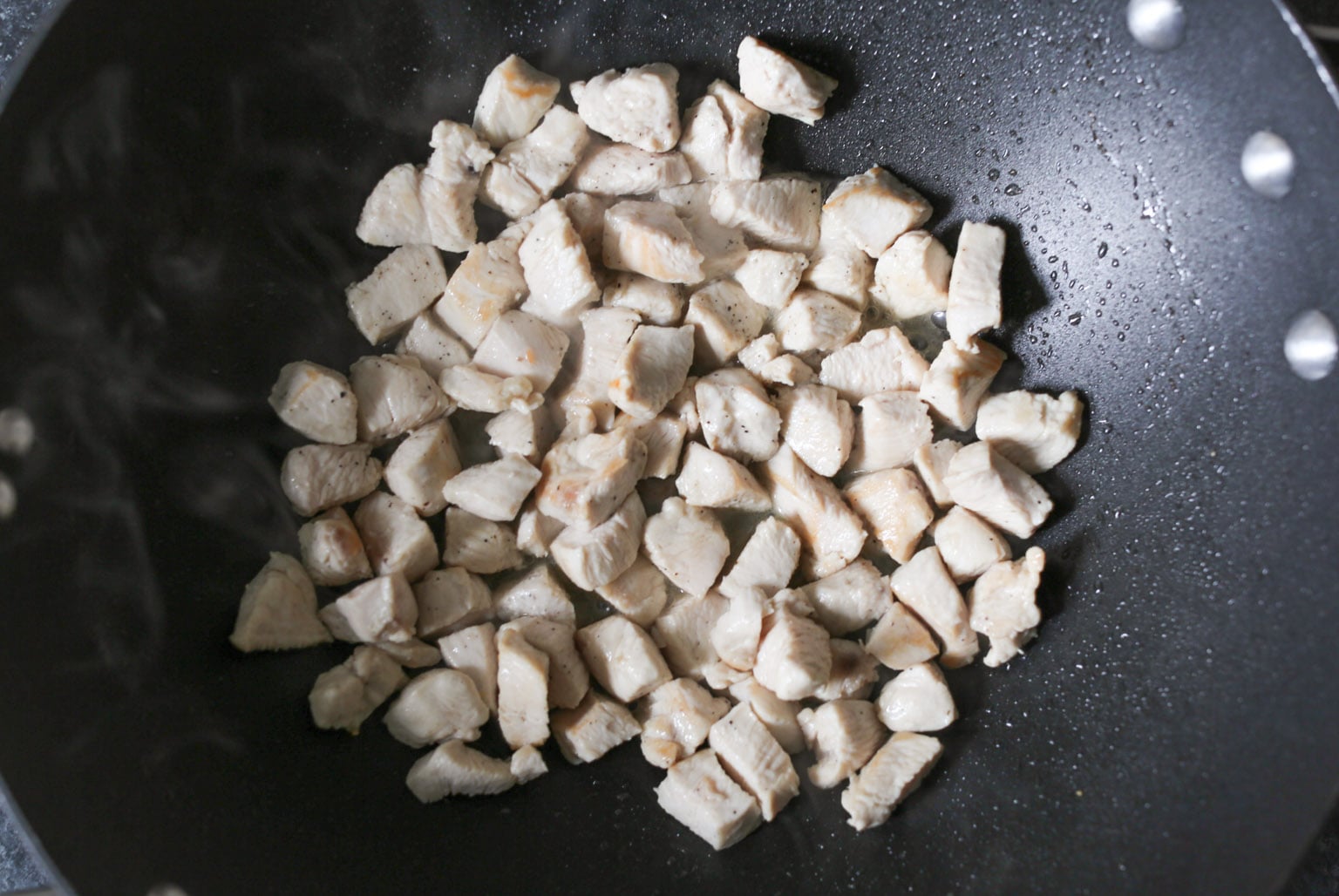• Heat ½ tablespoon of the coconut oil in a wok or large non-stick skillet over medium-high heat. When the oil is hot and shimmering, add the chicken to the pan in an even layer. Let the chicken cook for 2 minutes undisturbed (you want to get some light browning action going), then continue cooking for 2-3 minutes until cooked through. Transfer the chicken to a bowl and set aside.