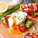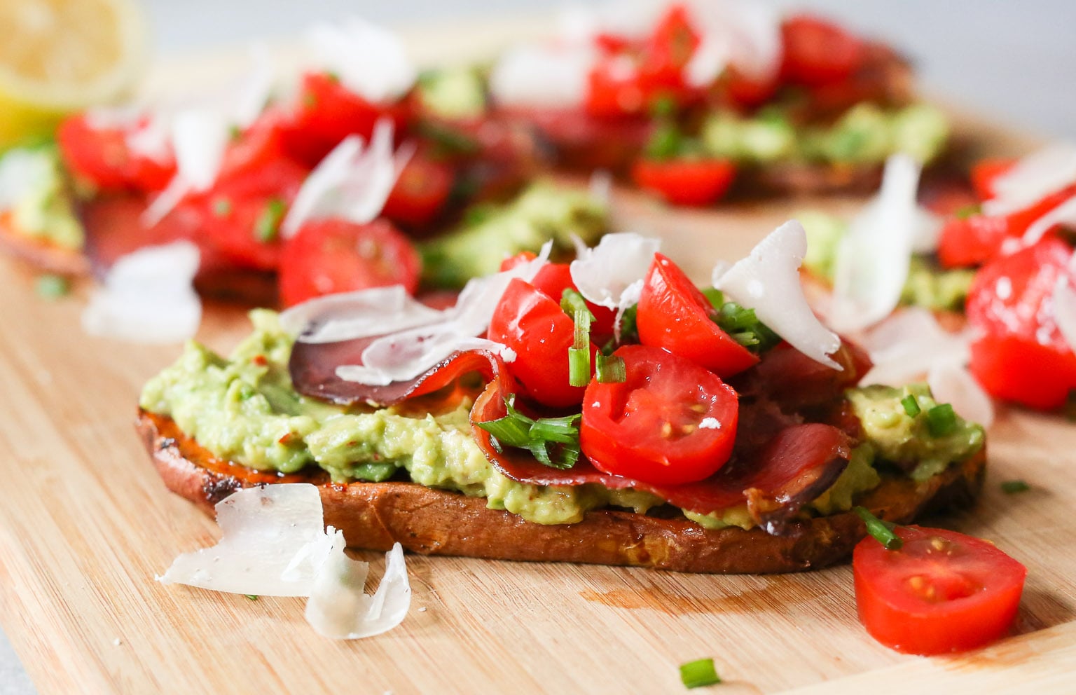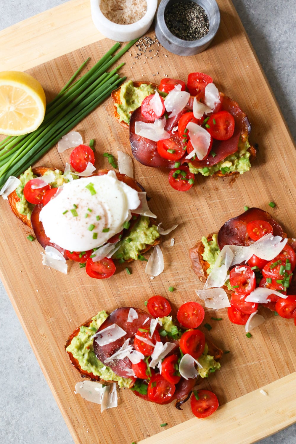 • Assembly time! Spread each sweet potato “toast” with one quarter of the avocado mash. Add a slice of crispy prosciutto and top with the cherry tomatoes, Parmesan, and chives. Serve topped with poached or fried eggs if you like.