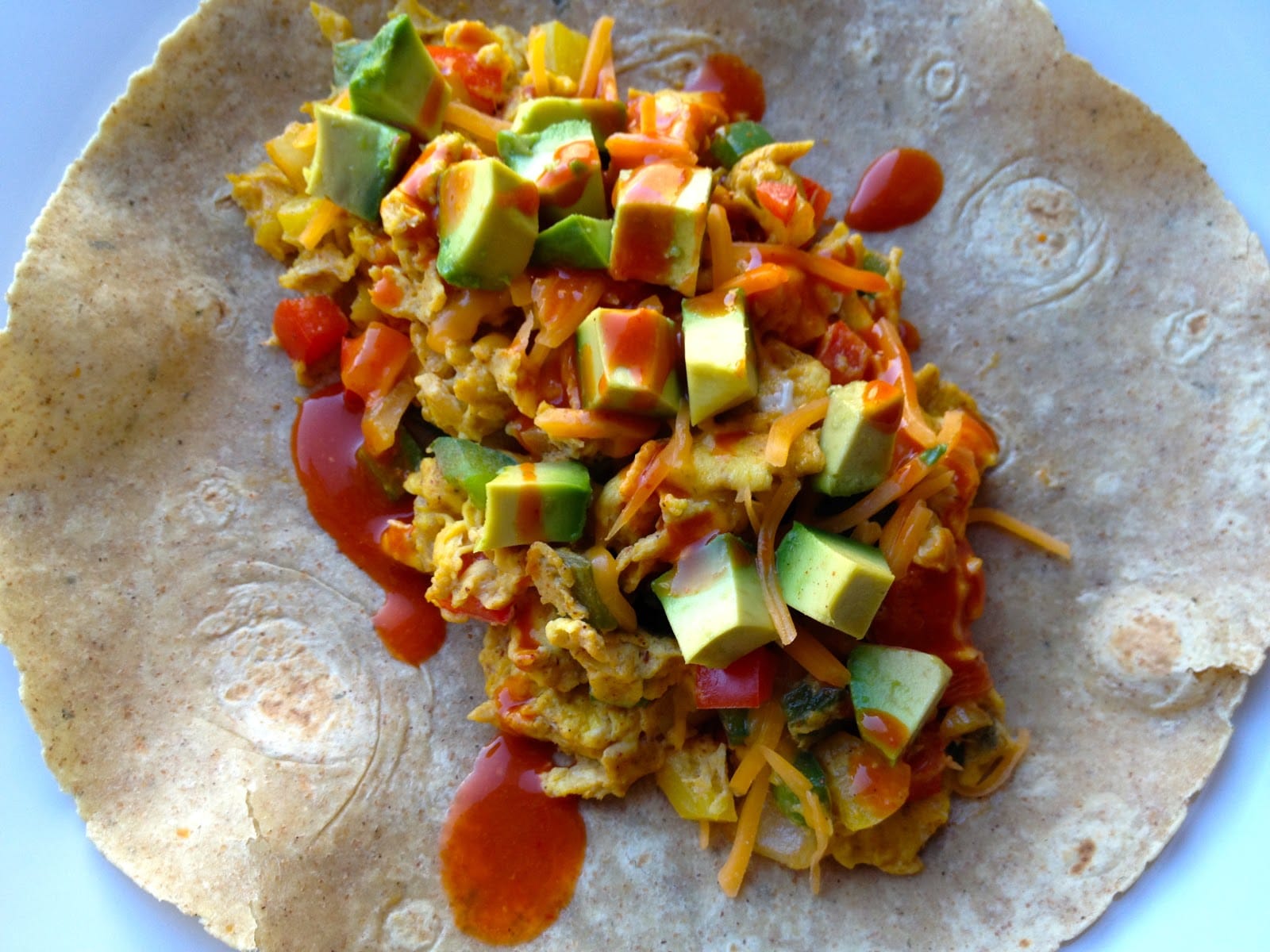 • Microwave the tortilla for 10 seconds. Place your scramble in the center of the tortilla and top with the cheddar cheese, avocado, and a drizzle of hot sauce (if using). Roll that bad boy up and enjoy your guilt-free breakfast fiesta.