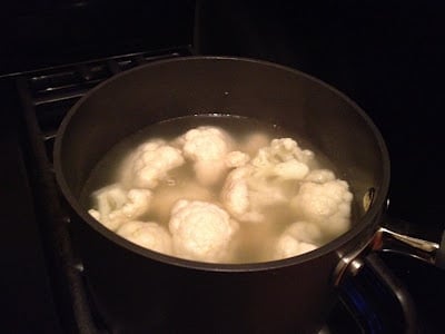 -Place florets in a pot and add either milk or chicken stock. Bring to a boil and then lower to a simmer. Simmer until cauliflower is very tender, approximately 12 minutes.