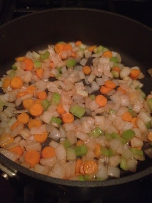 -Chop the vegetables into mirepoix (small dice).