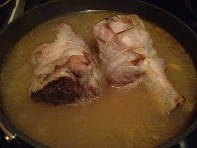 -Add the pork shanks and the chicken stock until it covers ¾ of the meat. Bring to a boil, lower to a simmer and cover.