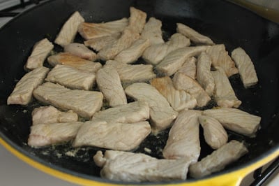 -Heat 1 tablespoon sesame oil in a large non-stick pan over medium heat. When hot, add your pork strips and sauté for 5-6 minutes until the pork is cooked through. Remove the pork from the pan and set it aside while you cook your vegetables and noodles.