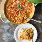 Feel free to whip up the sauce the day before or in the morning and then gently reheat it on the stovetop about 20 minutes before serving. Once it’s heated through, add the pasta, extra cheese and breadcrumbs (which you can also prep in the morning), and broil for a couple minutes after you’ve gotten the rest of your sides out of theoven. Done and done.